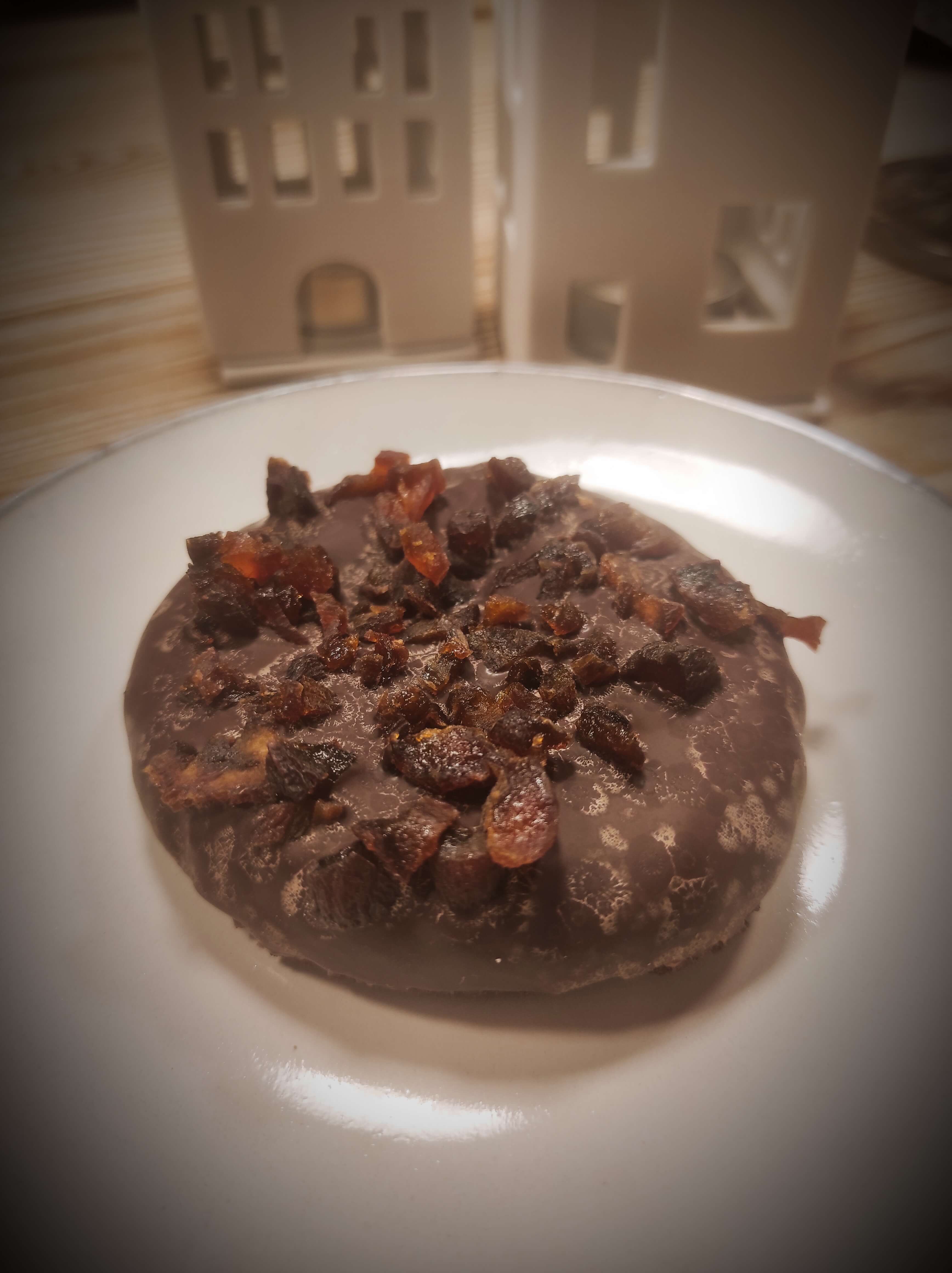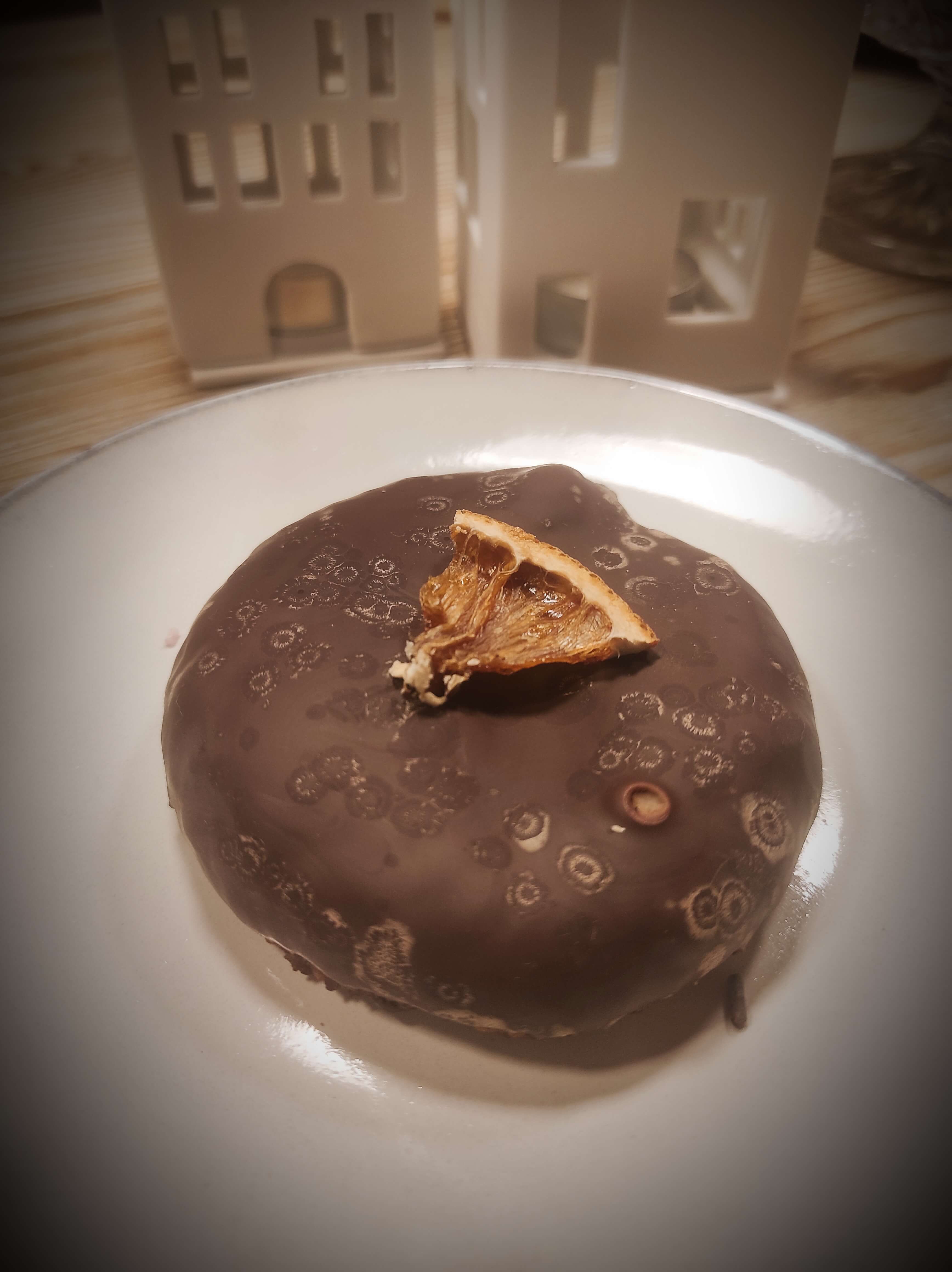 Mit Zartbitterschokolade glasiert und mit eigens getrocknetem Orangenstück garniert.