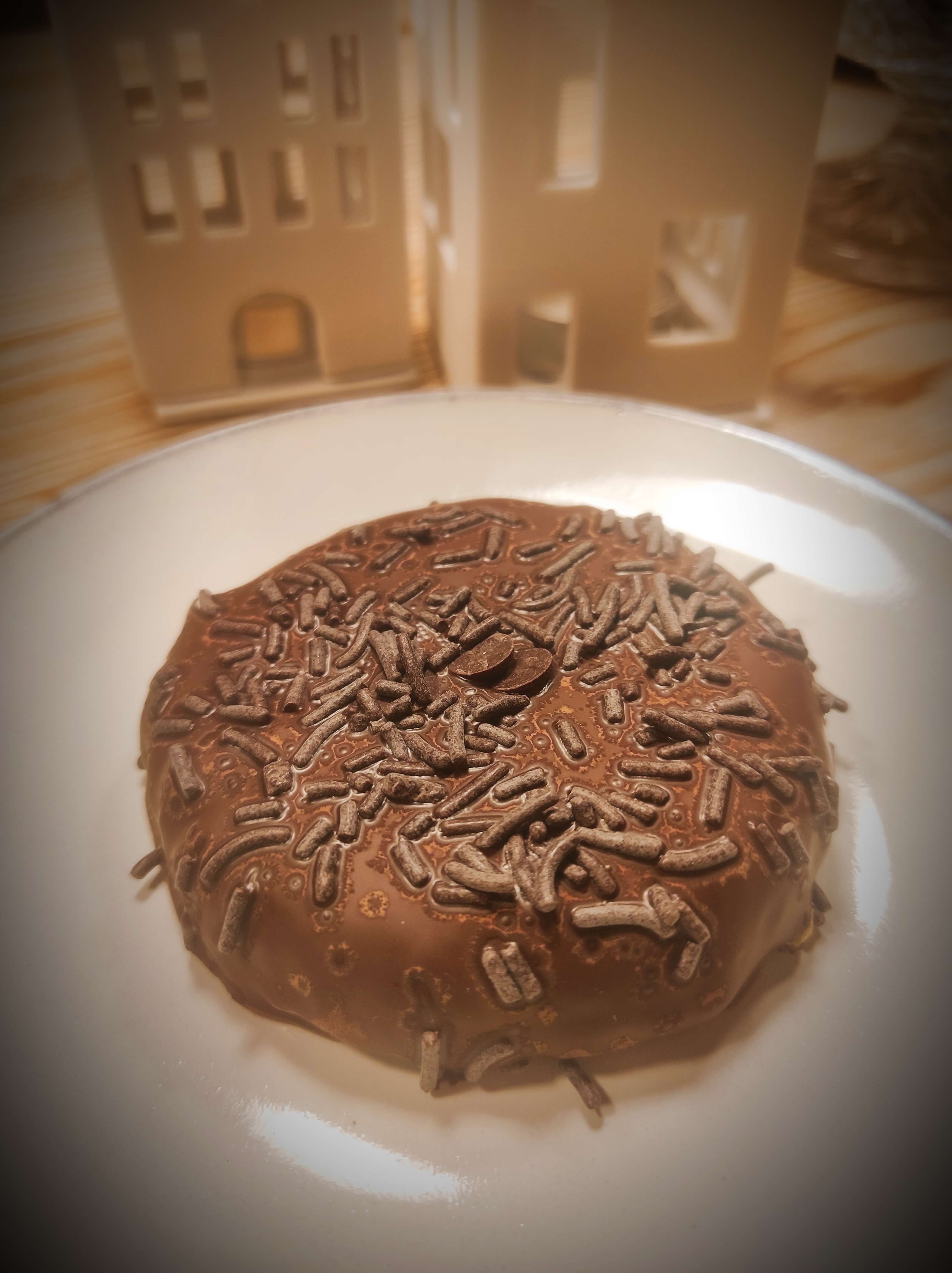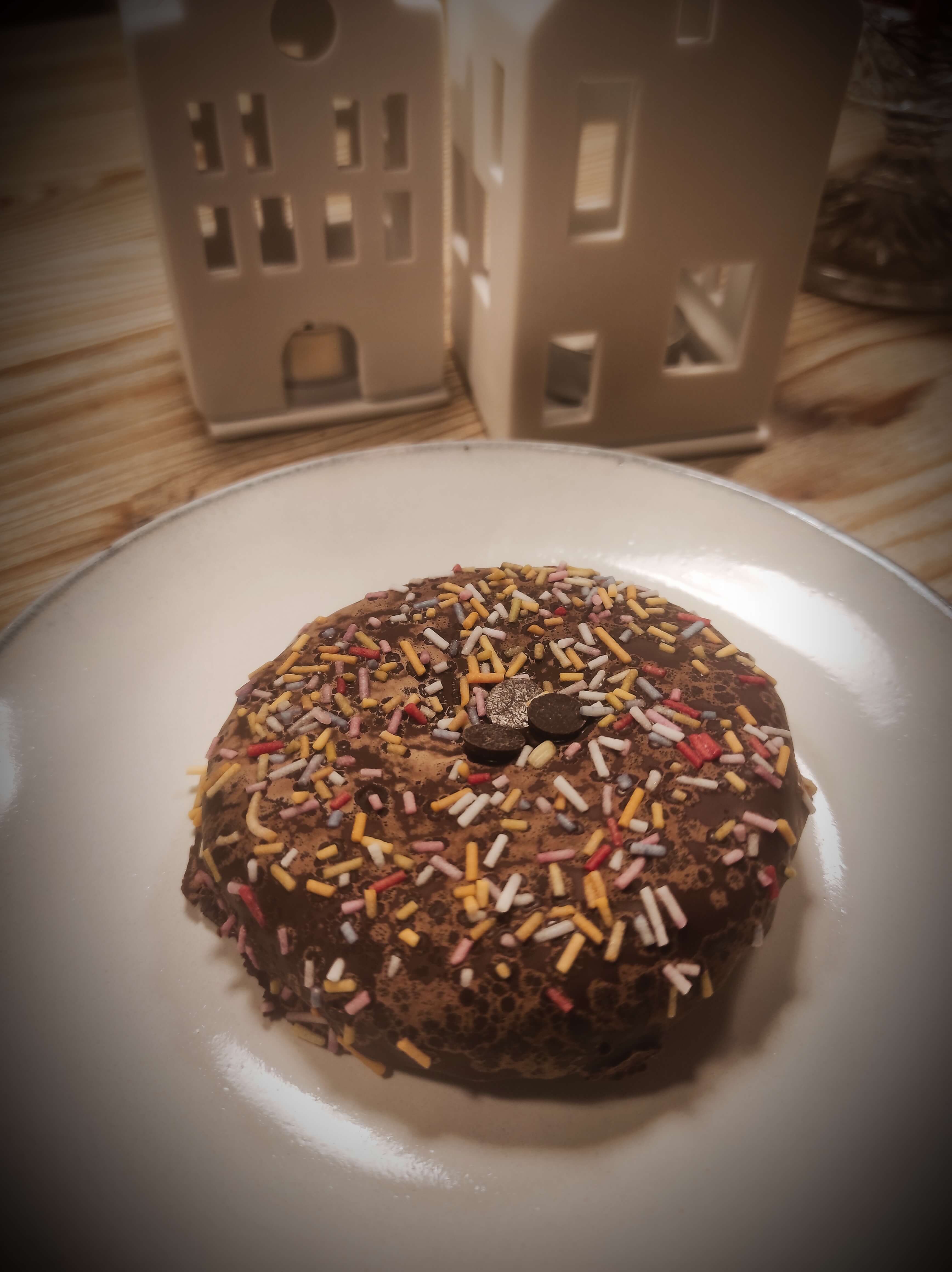 Mit Zartbitterschokolade glasiert und bunten Zuckerstreuseln.