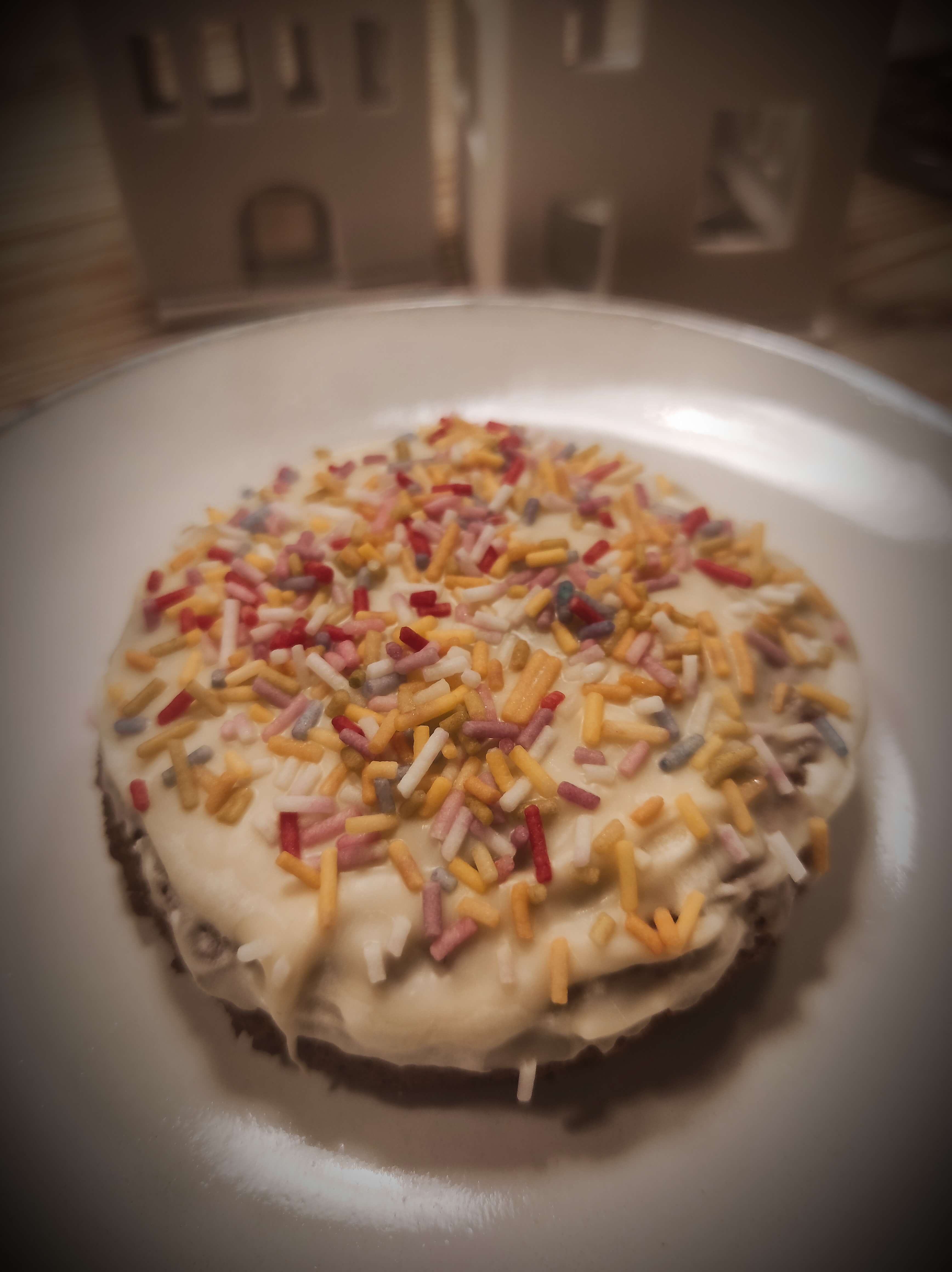 Mit weißer Schokolade glasiert und bunten Zuckerstreuseln.