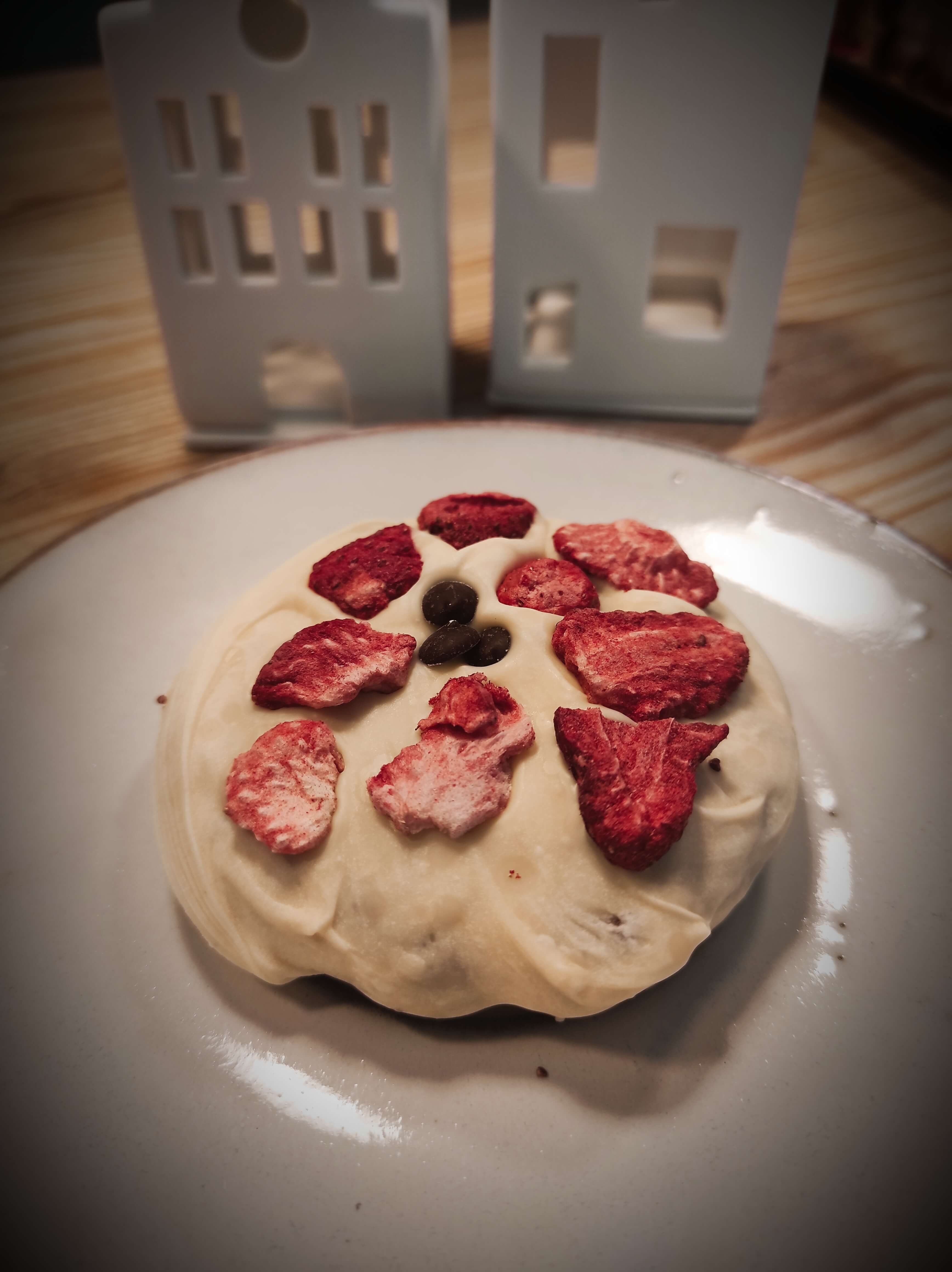 Mit weißer Schokolade glasiert und gefriergetrockneten Erdbeeren garniert.