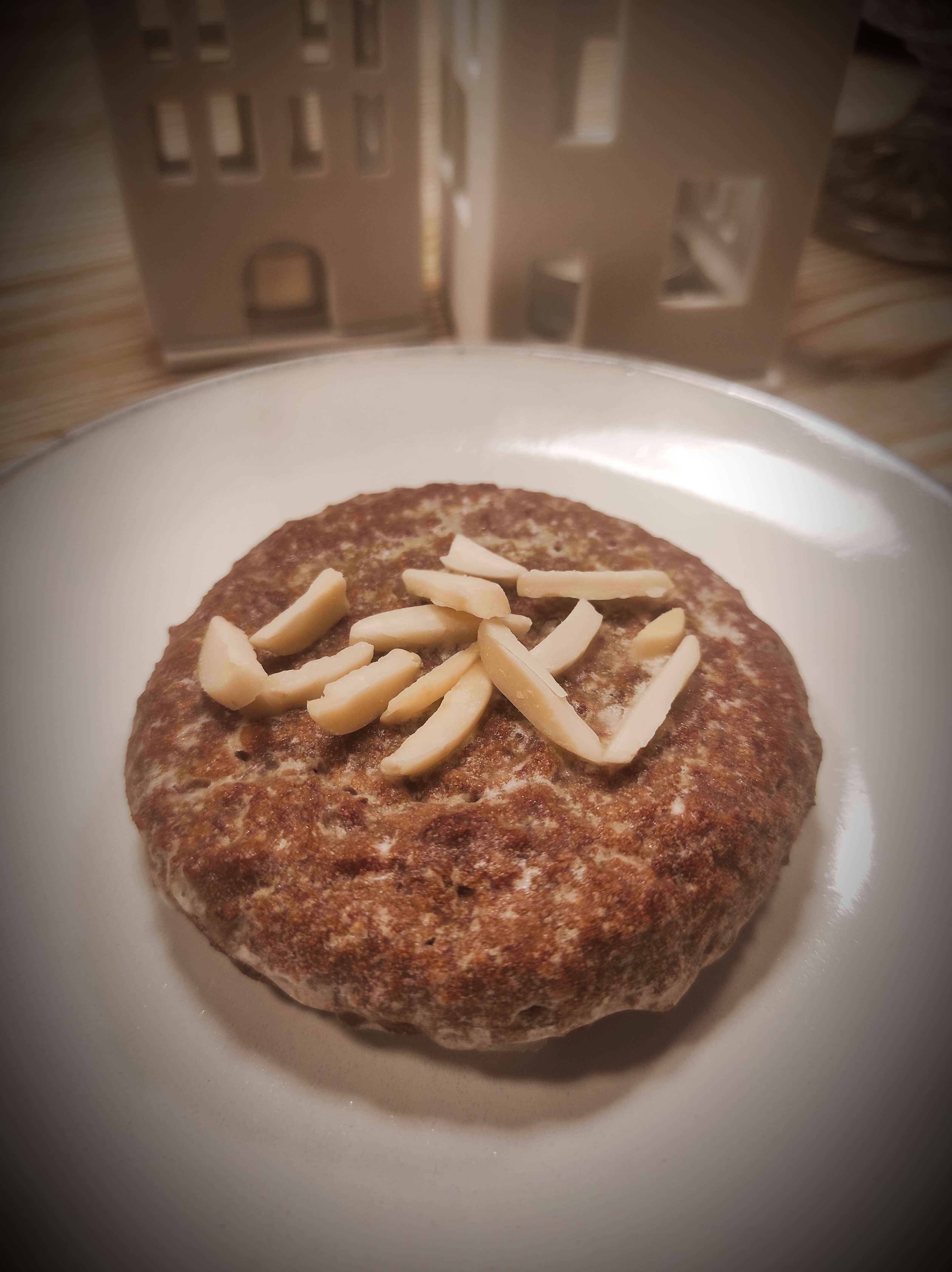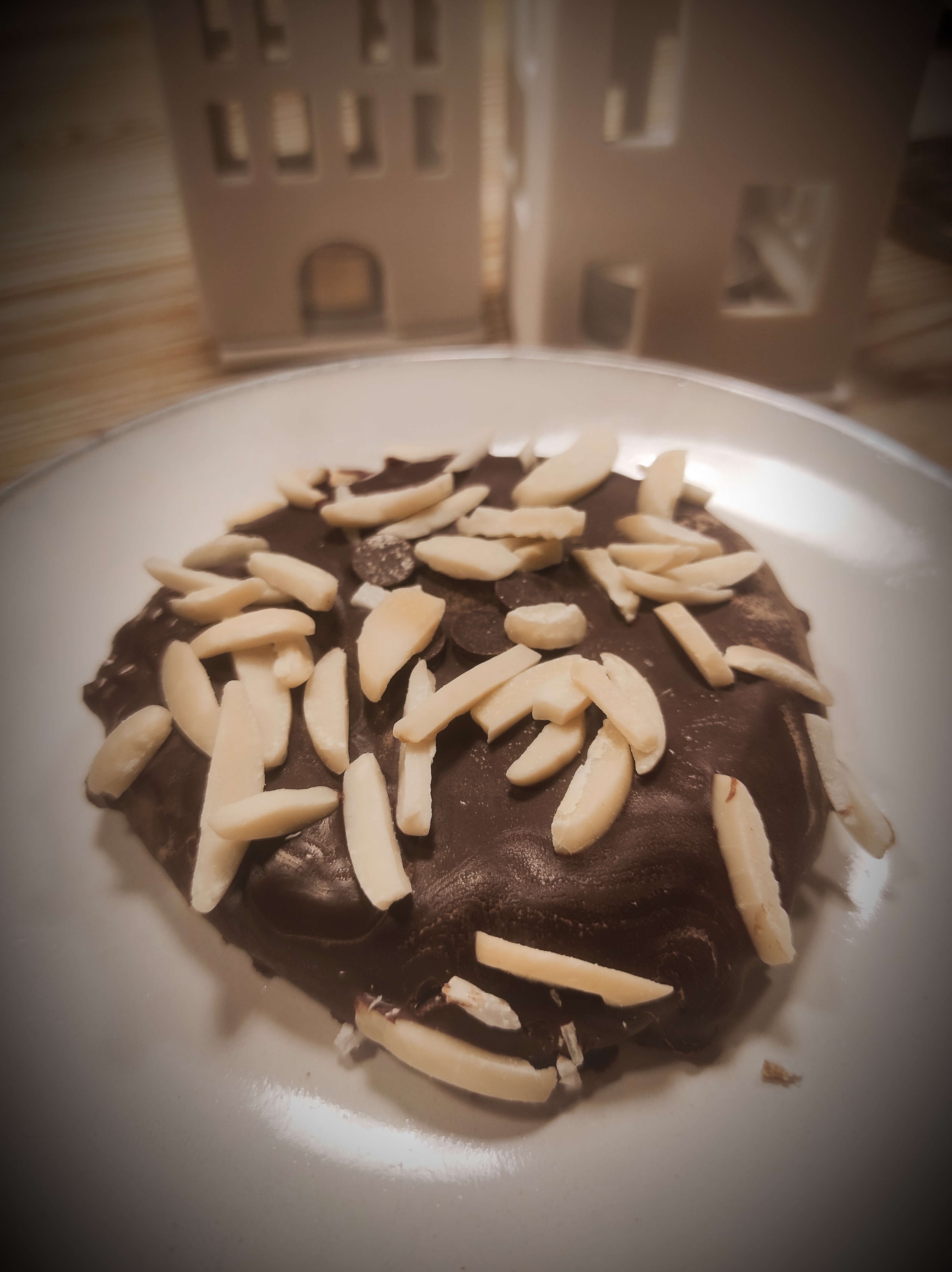 Mit Zartbitterschokolade glasiert und Mandelsplittern belegt.