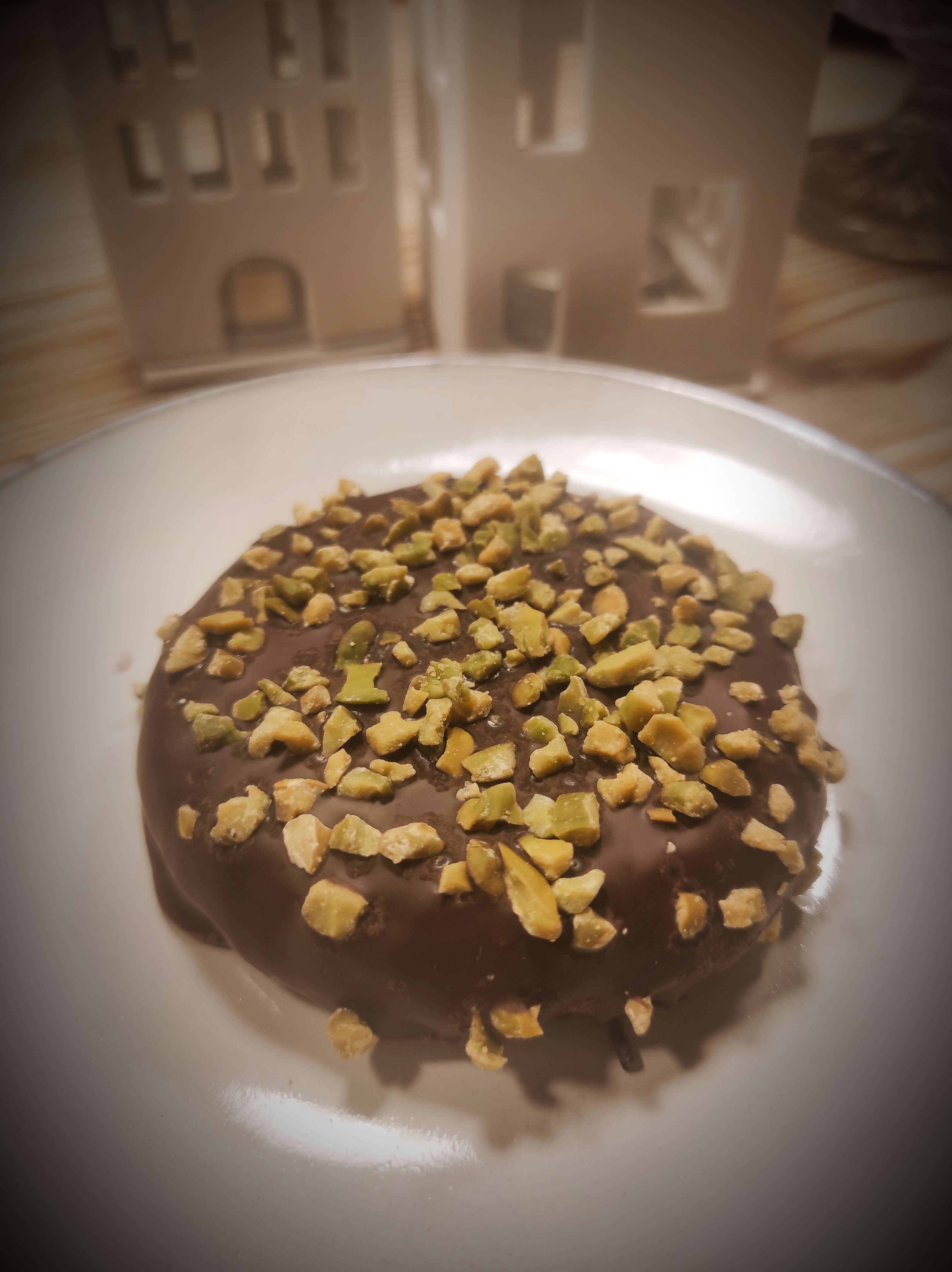 Mit Zartbitterschokolade glasiert und Pistazienstückchen