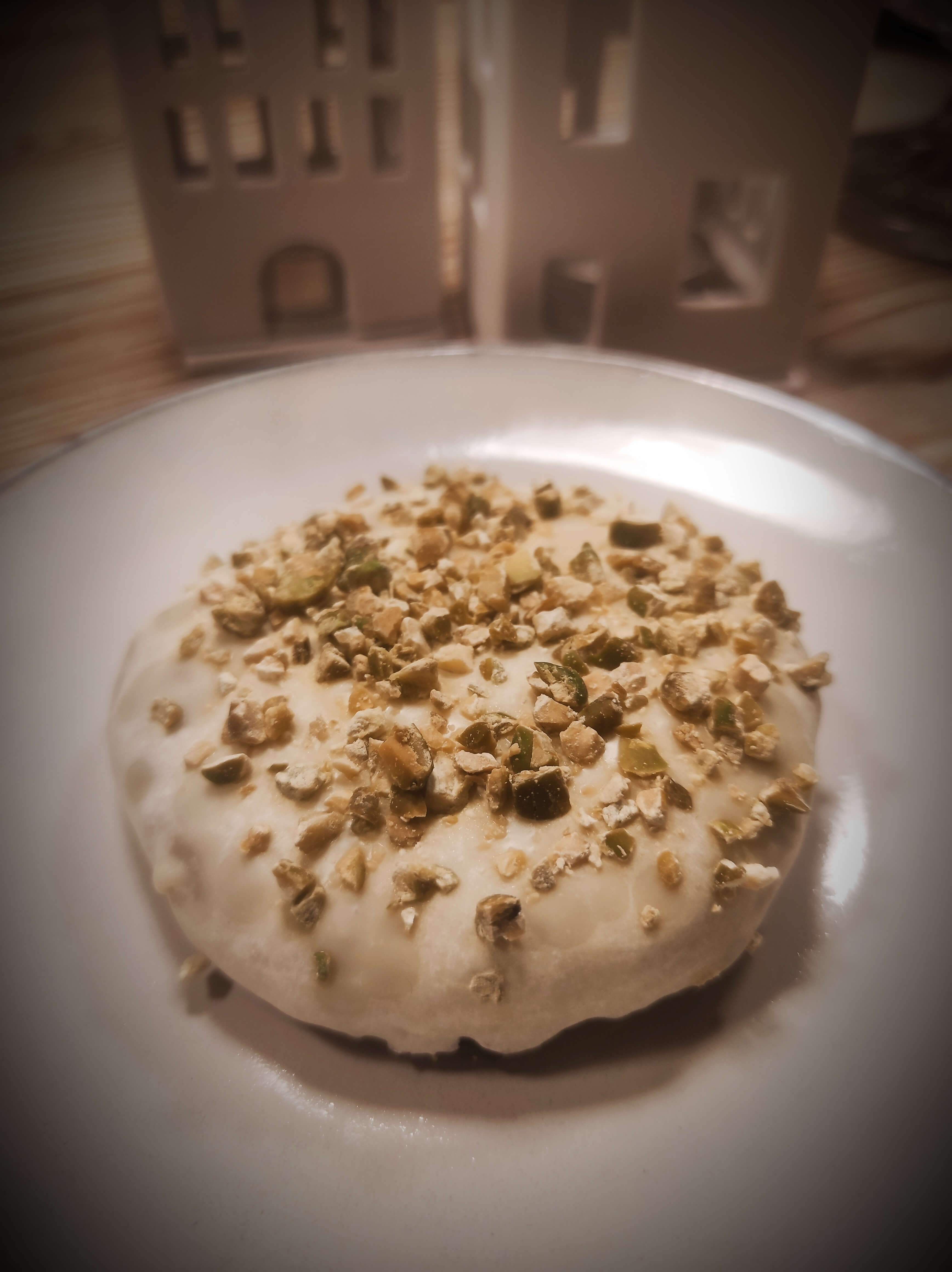 Mit weißer Schokolade glasiert und Pistazienstückchen